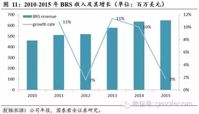 BRS 2015年收入为6.4亿美元,同期增长2%,占公司总收入的5.6%。Aladdin占BRS收入比82%,其主要收入来源是长期的合同收入。由图1可知,BRS收入逐年上升,除了2012和2015年收入增长较慢以外,最近五年的收入增长达到10%左右。