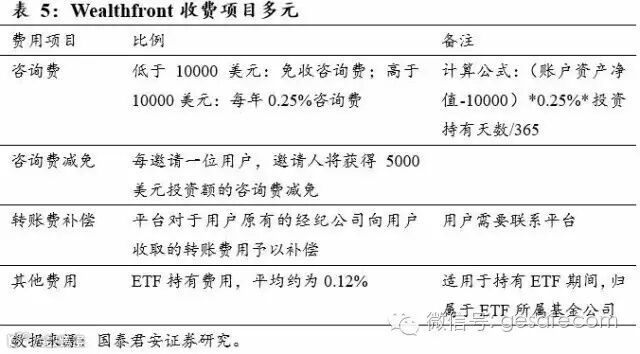 Wealthfront的特点是成本低,主要客户为中等收入年轻人,区别于传统理财主要针对高净值人群。平台的盈利来源为其向客户收取的咨询费(advisory fee)。