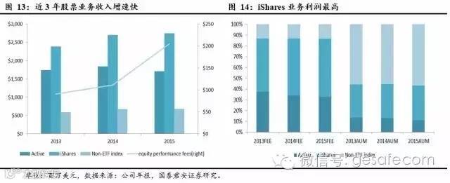 2013-2015年,股票的业绩收入上升明显,由9100万美元升至2.05亿美元。主动管理组合收入较为稳定,略有下降;iShares(股票ETF)组合收益逐年上升,且收入占比最高,约占50%;非ETF指数型组合收入稳定,占比约为10%,但其AUM超过50%。公司的iShares是公司的明星业务,体量大,且管理费低,相较于非ETF指数型基金有较多的优势。