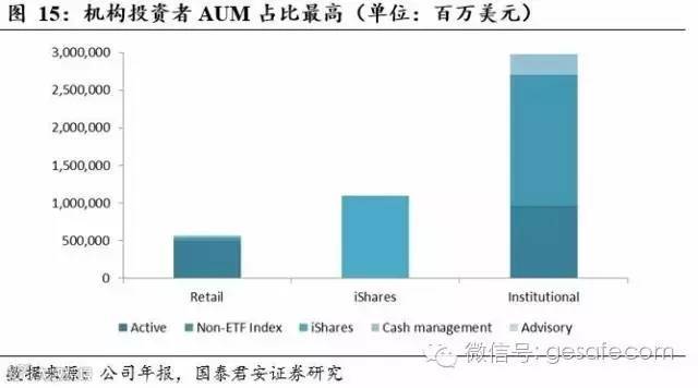 2015年公司权益投资中,机构客户AUM约为2.7万亿美元,占比最高,且主要是非ETF指数型投资,其次是积极管理型;零售客户AUM约为5411万美元,占比最低,其中主动型投资占比最高;iShares投资中包含零售和机构客户,投资金额约为1.09万亿美元。