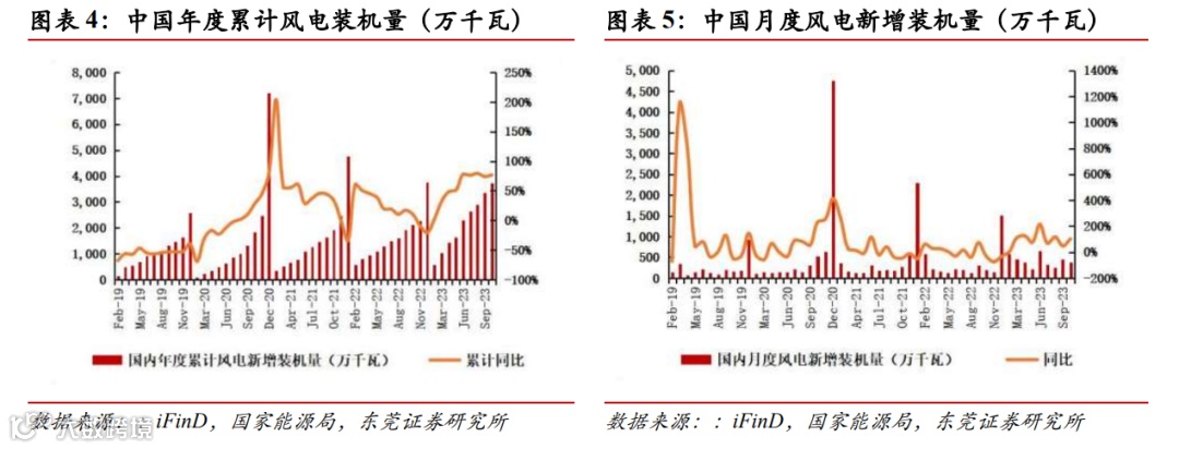 1)今年全球风电装机量同比高增,行业景气度显著回升。国内方面,2023 年 1-10 月,中国风电新增装机 37.31GW,同比增长76.49%,较1-9月加快 2.48pct。