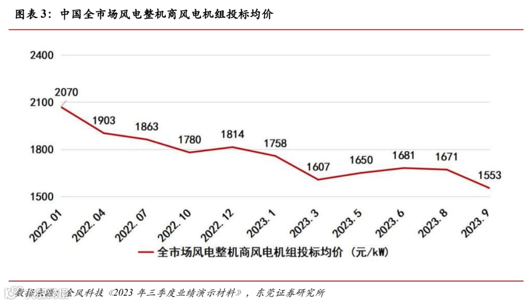 下跌原因分析:(1)2022 年以来,随着国家补贴的退出,中国风电行业进入了平价发展阶段,行业降本压力较大,2022 年中国海上风电新增装机量约 5.1GW,同比大幅下滑七成。截至2022年年底,中国海上风电累计装机量为 31.4GW,同比增长 19.1%。(2)从近两年中国全市场风电整机商风电机组投标均价变化情况看,受风电行业降本压力因素影响,风机整机价格出现明显下滑趋势,全市场风电整机商风电机组投标均价从2022 年 1 月的 2070 元/kW 降至 2023 年 9 月的 1553 元/kW,下滑幅度约25%。