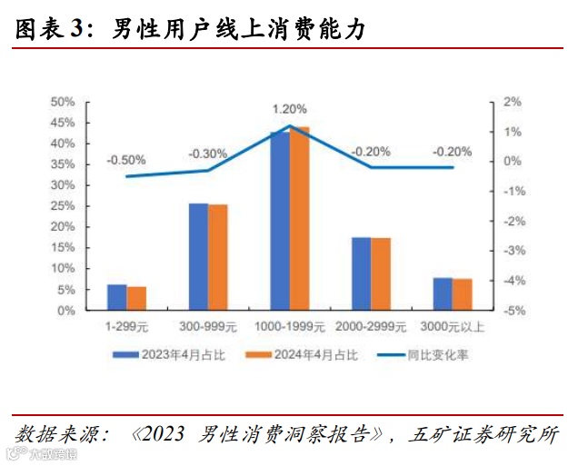 3)男性购物特征:购买稳定性强、品牌忠诚度较高,男性消费者对于满意品牌的复购率可以达到 40%左右,客单价高过女性。《中国奢侈品网络消费白皮书》提到,男性的客单价比女性高 6%,且奢侈品消费频次在 3 次及以上的男性比例也比女性高。