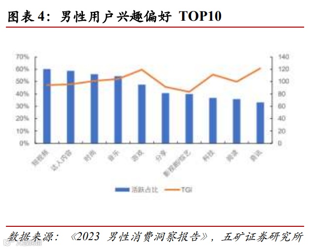 2)男性对娱乐、理财、科技等多个方面展现浓厚的兴趣,泛娱乐属性突出。数据显示,男性用户对线上社交平台的使用行为不断加深,活跃于 IT、摩托、游戏、动漫等多个兴趣社区;男性人群对信用消费接受度更高,各大信用卡 APP 围绕吃喝玩乐的高平消费场景拓展,优惠权益吸引更多男性客户。