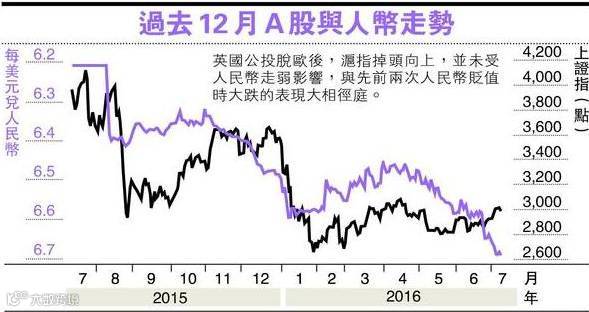 去年11 月至今年1 月上旬,人民币下跌4.2%,直到央行连番重手出招才终止贬值。此轮贬值引发中国创记录的走资潮,去年12 月创下1079 亿美元的外汇储备历来单月下跌新高,甚至一度令市场担忧外储将跌破3 万亿美元。期间上证指数[1.35%]亦1 跌5%,年化跌幅约30%。