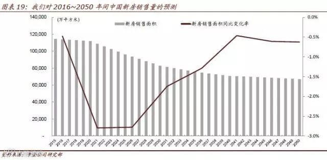 我们预计2016~2020 年间新房销量将保持在11~12 亿平米,之后将开始减速下降,在21 世纪30 年代、40 年代稳定在每年7~8 亿平米。