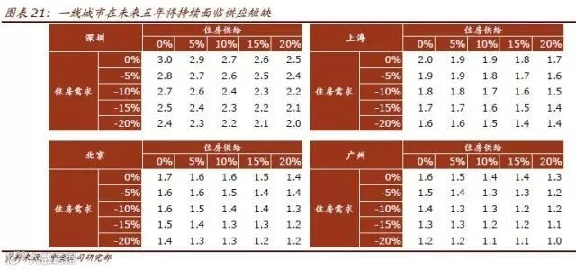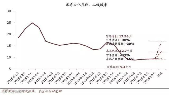 中金认为一、二线城市供不应求的情况会在一定程度上得到改善,但难以彻底解决,因此房价继续上涨的压力仍然存在。目前数据显示截至9月底,一、二线城市的库存去化月数分别为9.3、9.4 个月,情景分析显示2017 年供需关系不会有太大改观。