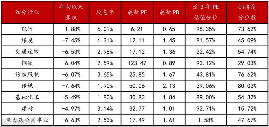 银行和煤炭行业的股息率较高,且估值水平相对合理,值得关注。交通运输和电力及公用事业行业虽然近期表现不佳,但股息率和估值水平也显示出一定的投资价值。其他行业如钢铁、纺织服装等,虽然股息率较低,但在特定情况下也可能存在结构性机会。