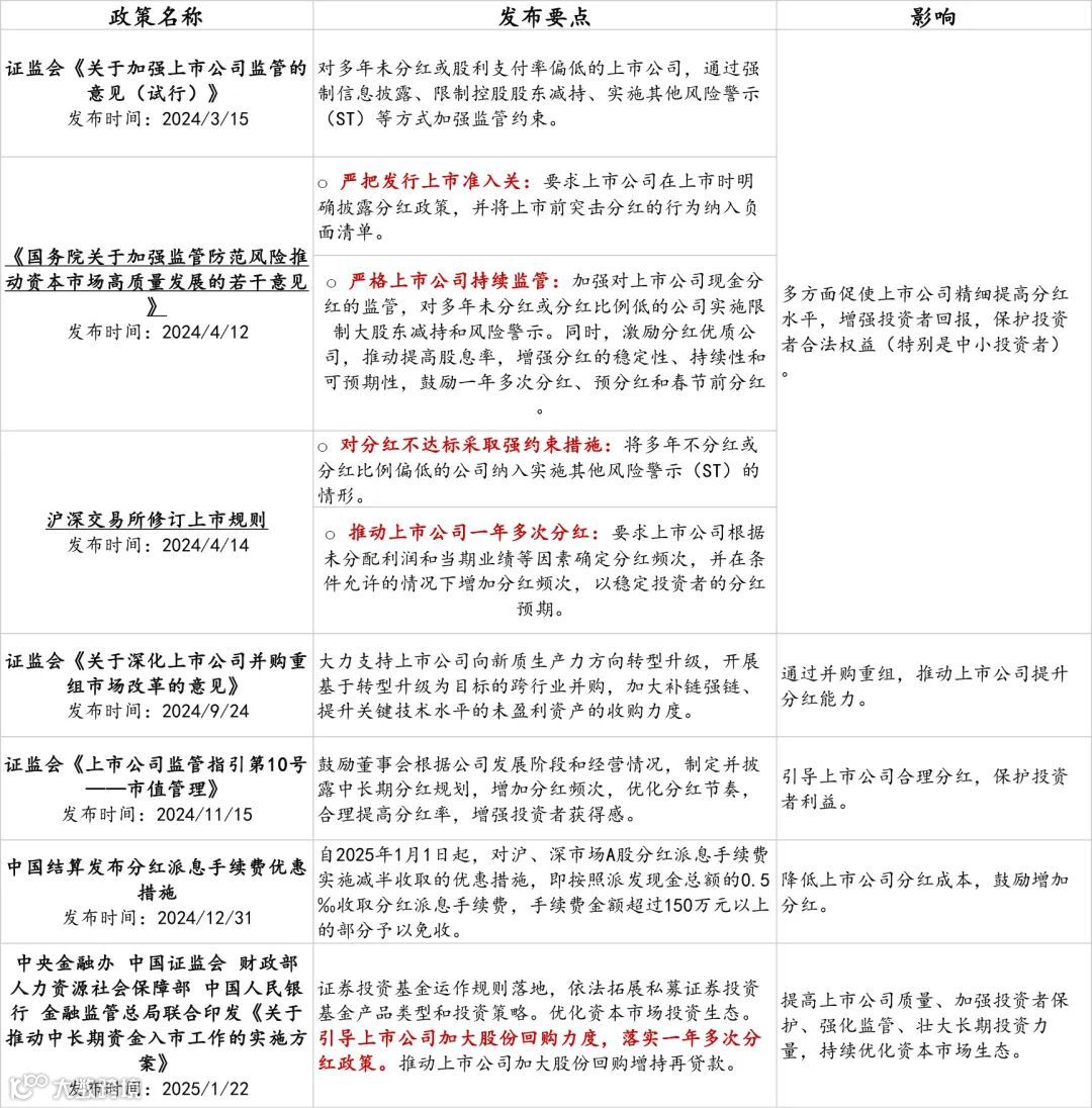 自2024年至今,我国资本市场一系列重大政策调整均从不同角度助力上市公司提升分红能力,鼓励增加分红。这些政策的连续出台,反映了监管层对市场稳定性和投资者利益保护的重视,更预计将显著改善上市公司的分红状况。红利投资的空间有望进一步打开。
