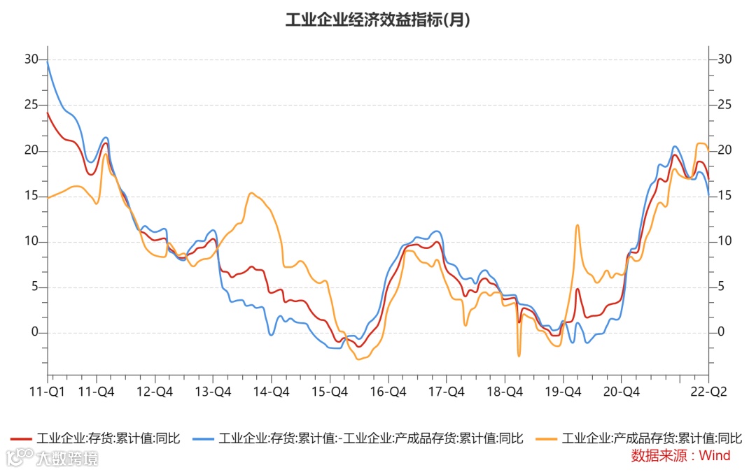 我们用工业企业存货减去产成品存货这一指标来衡量企业的原材料库存和半成品库存,并以此来衡量企业的库存变化是主动行为还是被动行为。我们可以看到从20年下半年开始至21年底,企业库存增速一直在大幅上升,这对21年名义GDP增长的贡献约2个百分点。但这期间工业企业的行为一直是主动补库存,反映出企业本身对经济是乐观的,对产品销售和盈利前景也是乐观的。但是我们看到今年以来,企业的产成品库存增速还是上升,但企业的主动补库存行为已经开始出现明显下降,这样的数据反映出企业生产出来的产品是滞销的,企业主动补库存的意愿下降,虽然企业存货增速依然高于名义GDP增速(上半年企业存货的增长对名义GDP贡献仍有约2个百分点),但这其实是由企业被动累库存造成的,这样的库存增长是不可持续的,后续存在企业降库存的风险。