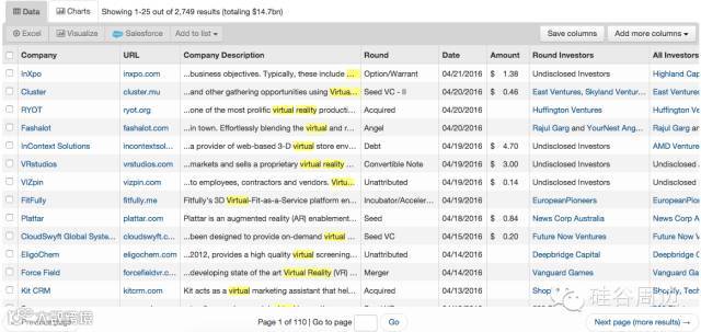 如果我们搜索从十年前(2006年1月1日)到今天(2016年4月23日)之间的有关"Virtual Reality"公司的全部deals,包括融资、并购、和IPO,会找到总价值为约147亿美金的2749个deals。