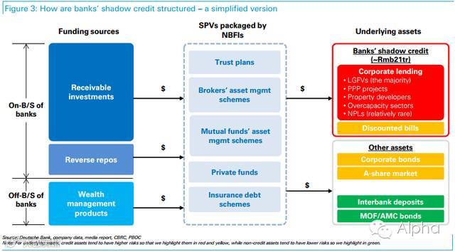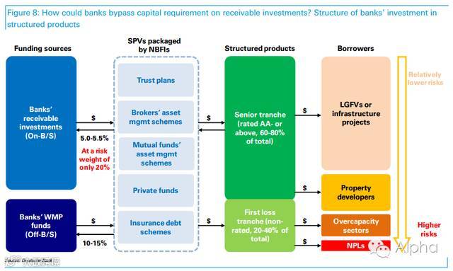 实际上与银行影子信贷相关的交易结构(transaction structures)有很多种变体,其中一些甚至通过多层中介进行打包,流程极为复杂。不过本质是相同的,比如借款给企业,并绕过对资本、贷款额度和风险拨备计提的当前监管措施。我们将在下文一一详解。