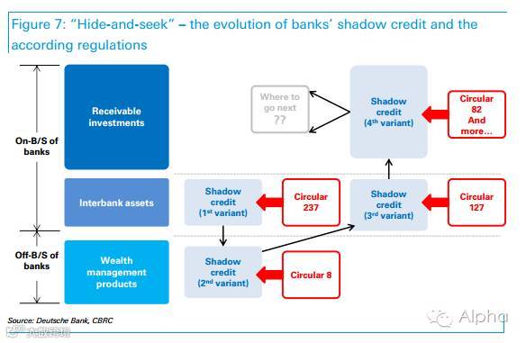 【针对影子银行的82号文】127号文有效的促使银行将非标信贷资产转移到应收款项投资。于是自2014年底以来资产负债表中的应收款项投资这一栏 大幅扩张。通过刻意的结构化转移(structured transaction),银行依然能把风险拨备和占用资本金降到标准之下。于是有了媒体所报道的,银监会4月28日下发针对影子银行监管的《关于规范银 行业金融机构信贷资产收益权转让业务的通知》(82号文),旨在收紧银行将非标信贷资产转移至表外的监管,并鼓励银行将信贷资产受益权转让到银监会辖下的 银行业信贷资产登记流转中心(银登中心)进行登记交易。不过德意志银行认为,目前82号文还只是堵一小块漏洞,预计还会有进一步监管措施出台,遏制与影子 银行扩张相关的风险。