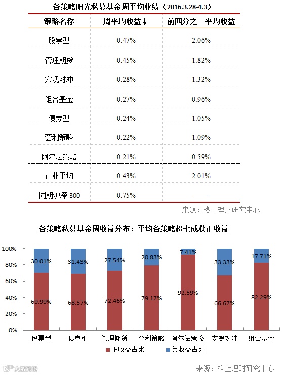 一、阳光私募业绩表现:上周各策略平均收益全面翻红,一季度私募业绩相差悬殊