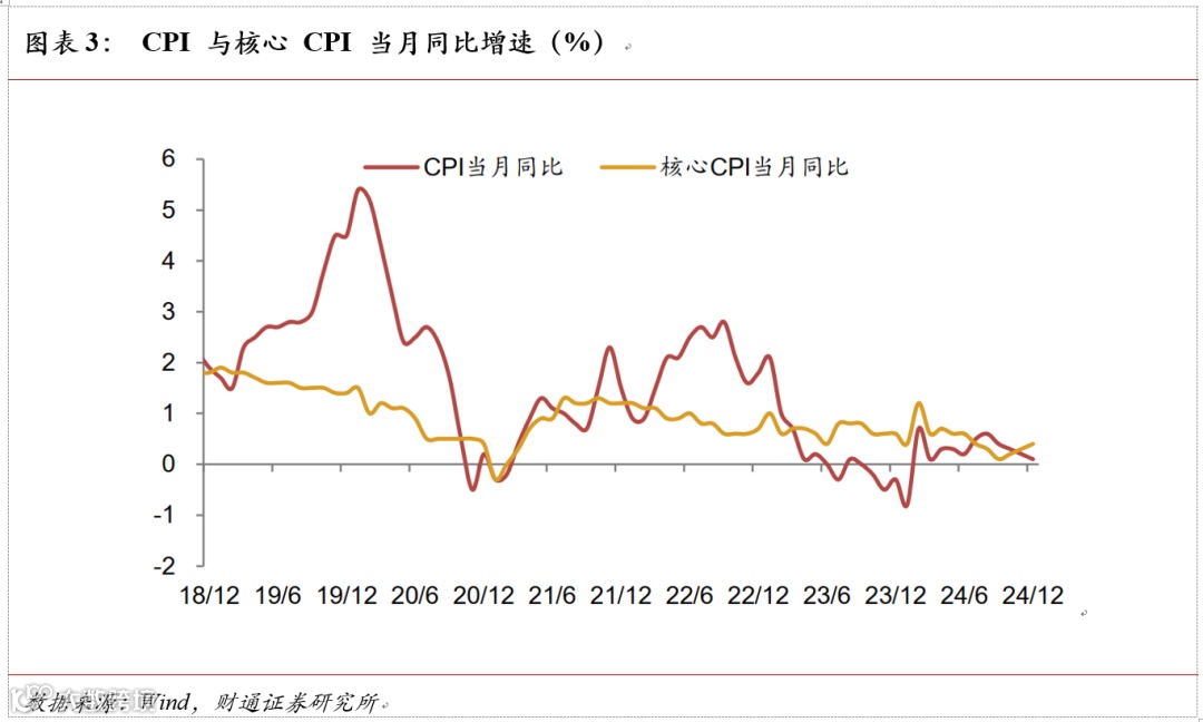 CPI 继续放缓,PPI 降幅持续收窄。近 3 个月 CPI 和 PPI 走势持续背离,与外生的天气偏暖及人为的生猪压栏育肥等因素有关,核心 CPI 与 PPI 走势保持基本一致。CPI 方面,12 月 CPI 环比季节性改善,但同比增速录得 0.1%,较上月继续放缓。PPI 方面,随着部分行业进入淡季,环比增速转负,不过在系列政策催化下,同比降幅继续收窄至-2.3%。全年来看,CPI 较上年上涨 0.2%,增速持平上年,核心 CPI 较上年上涨 0.5%,增速较上年放缓 0.2 个百分点;PPI 下降 2.2%,增速较上年回升 0.8 个百分点。