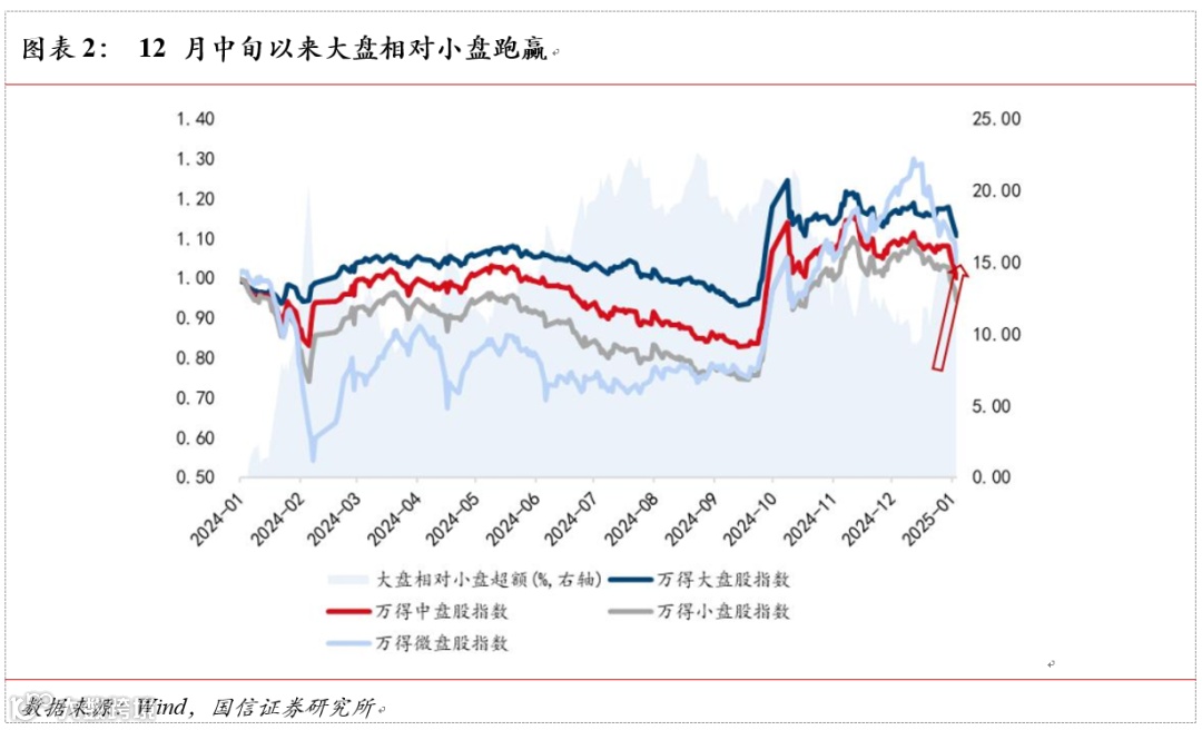 近期市场的快速调整主要由下列几个方面所致:1)特朗普即将上任,交投情绪快速出清阶段对特朗普上任后的政策不确定集中定价;2)一月进入年报预告披露期,分子端未见明显修复信号的情况下, 投资者对分子端有所忧虑;3)“9.24”行情以来的增量资金贡献者——非机构投资者情绪快速退坡。亏损股、 国证 2000 等机构定价权较弱的结构, 筹码获利比率 12 月 12 日达到 100%后出现短线筹码快速止盈。
