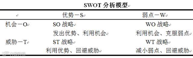 “SWOT”是Strength、Weakness、Opportunity、Threat四个英文单词的缩写,这个模型主要是通过分析企业内部和外部存在的优势和劣势、机会和挑战来概括企业内外部研究结果的一种方法。