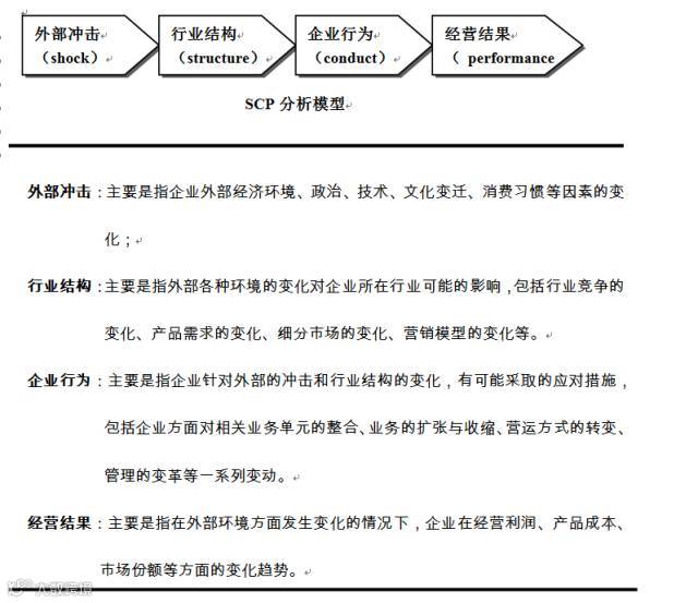 SCP模型从对特定行业结构、企业行为和经营结果三个角度来分析外部冲击的影响。