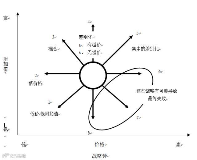 战略钟模型将产品/服务价格和产品/服务附加值综合在一起考虑,企业实际上沿着以下8种途径中的一种来完成企业经营行为。其中一些的路线可能是成功的路线,而另外一些则可能导致企业的失败。