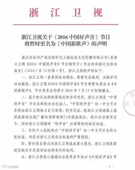 7月6日晚间,浙江卫视官方微博发布声明称,《2016中国好声音》节目将暂时更名为《中国新歌声》,节目更名后仍将于7月15日如期播出。