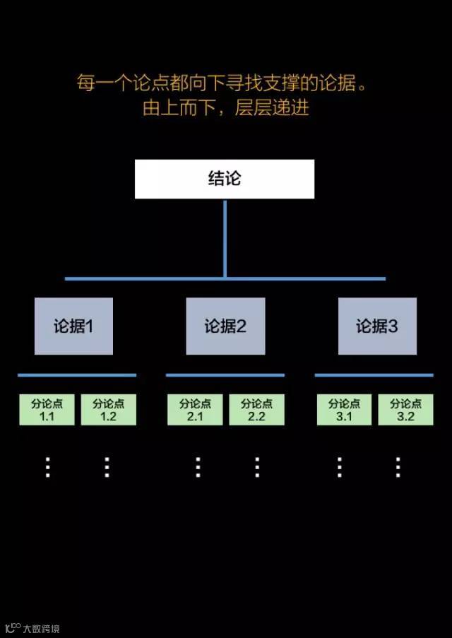 当阐述完核心观点之后,接下来需要进行解释,即“为什么这么做”。就像写论文一样,首先是核心论点,接下来是支持核心论点的分论点,然后是二级分论点,依次向下排列。如下图所示: