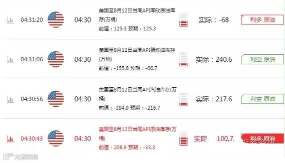 今日凌晨4:30,美国石油协会(API)公布的数据显示,截至8月12日当周,美国API原油库存意外大减100.7万桶,此前预期减少33.3万桶,库欣原油库存减少68万桶,但API汽油库存意外大增217.6万桶。