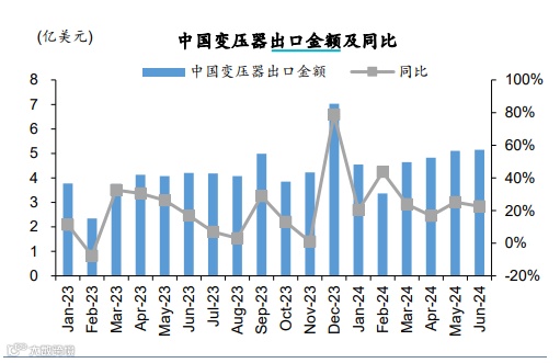 海外需求强劲,欧洲及中东北非为中国出口高增长区域。中国、韩国变压器出口延续增长趋势,油变出口增速中韩均显著强于干变,中国实际出口增速最高,绝对值贡献最大的区域为欧洲、海湾七国及北非。中国1H24出口28亿美元,同比增长 24%,6月出口5.2 亿美元,同比增长 23%。其中分品种来看,上半年电力主变/配电油变同比增长 53%/49%,干变下滑 4%。