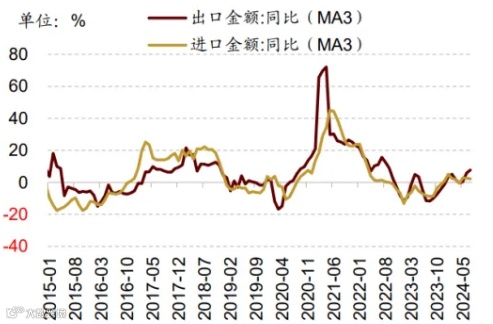 7月以美元计价出口金额当月同比7.0%(前值为8.6%),低于市场一致预期的9.54%;进口金额同比7.2%(前值为-2.3%),高于市场预期的2.99%。受益于较低基数、出口价格回升以及抢出口等因素,出口三个月滚动同比增速由前值的5.83%上升至7.73%。