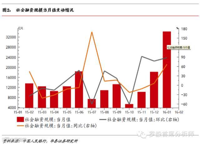 点评:社融和人民币贷款爆发式增长源于多重因素叠加:(1)季节性因素。银行代收财政存款上缴,春节前居民取现需求年初额度充足,且银行为平滑利润存在将上一年度贷款项目在年初投放的动机。(2)今年是十三五规划的开局之年,财政刺激政策加码,政府部门政策性建设融资需求增大,银行配套融资项目增多。据我们与多家银行沟通了解,1月地方融资平台贷款投放明显增多。1月财政部发布《对地方政府债务实行限额管理的实施意见》,要求对地方政府债务余额实行限额管理,取消融资平台公司的政府融资职能。未来融资平台公司将朝着市场化转型改制,通过政府PPP、政府购买服务等措施予以支持。银行对地方政府融资平台的投放或趋于审慎。(3)人民币对美元贬值预期下,企业负债呈现去美元化态势,人民币贷款增多。