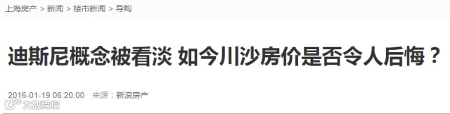 据《证券日报》报道,川沙板块处于上海外环外,之前曾为上海人不屑,6年前迪士尼刚一动工,这里的一手房成交均价不足1.9万元/平方米。