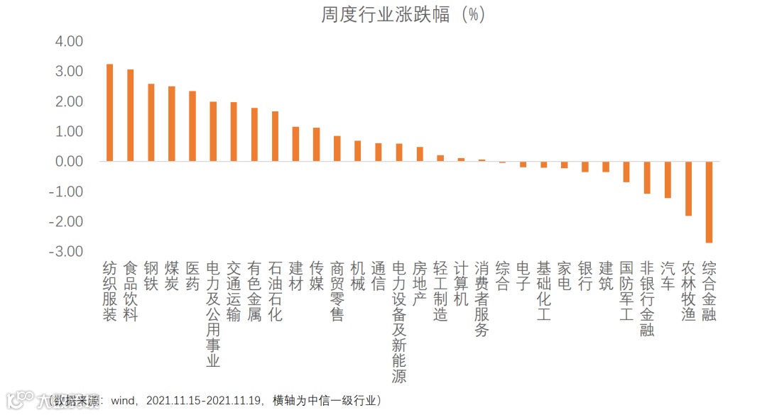 一周回顾:市场边际回暖,消费板块反弹,地产后周期承压。在消费边际回暖以及信贷政策预期松动的背景下,上证指数上涨0.60%,成交额环比略有上升,日均为1.1万亿左右,同时外资风险偏好提升,北上一周净流入111.8亿。风格上,顺周期的蓝筹股涨幅靠前。(数据来源: wind,2021.11.15-2021.11.19)