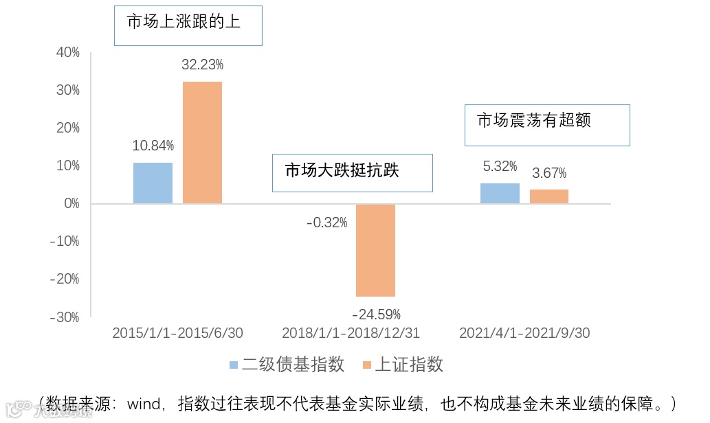 固收+产品一方面通过配置优质债券,力争绝对收益;另一方面,该类产品还会配置弹性更大的资产,如股票等用以增强收益。通常来说,固收+产品主要包括一、二级债基以及偏债混合基等类型,以二级债基为例,我们通过观察二级债基指数在市场不同阶段的表现,可以发现,二级债基具备“能涨抗跌”的属性,尤其是在当前震荡不断的弱市之下依旧有机会取得超额收益。