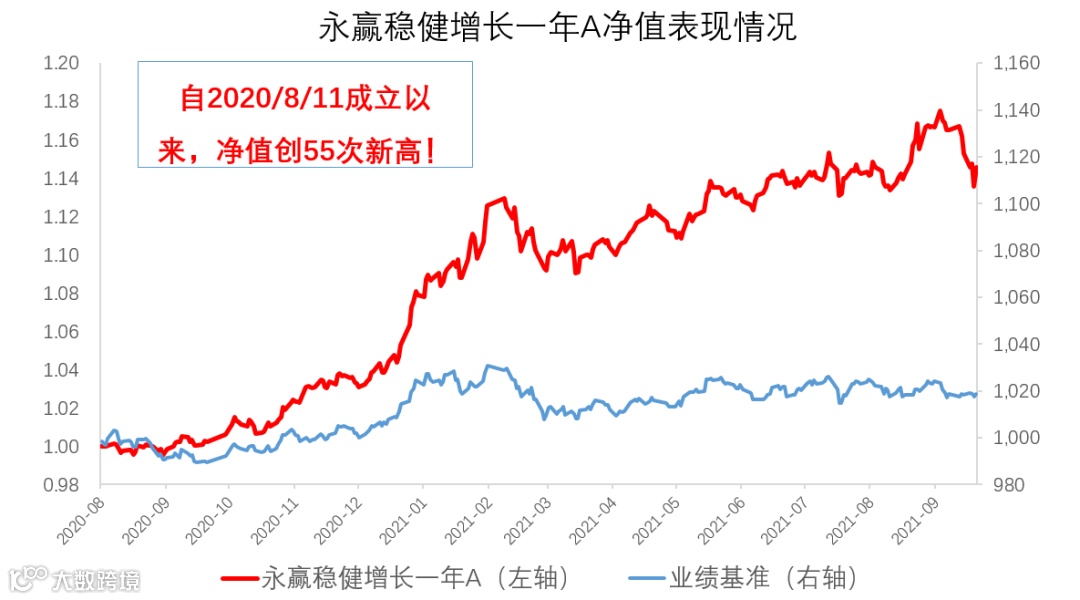「稳健系列」中成立满一年的产品——永赢稳健增长一年A成立至今,平均权益仓位不足22%,总回报14.55%,高达同期业绩基准的7倍+①!