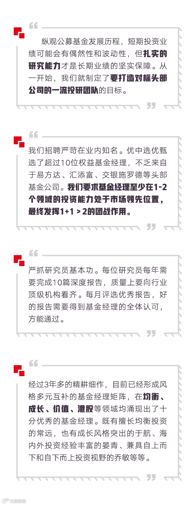 规模只是结果,更深远的价值体现在永赢基金前瞻的格局和视野,以深度研究驱动投资的理念,打造出极具竞争优势的一流投研战队。投研团队卓尔不群,投资业绩自然水到渠成,永赢基金近3年股票投资主动管理能力长期评价排名11/104②。