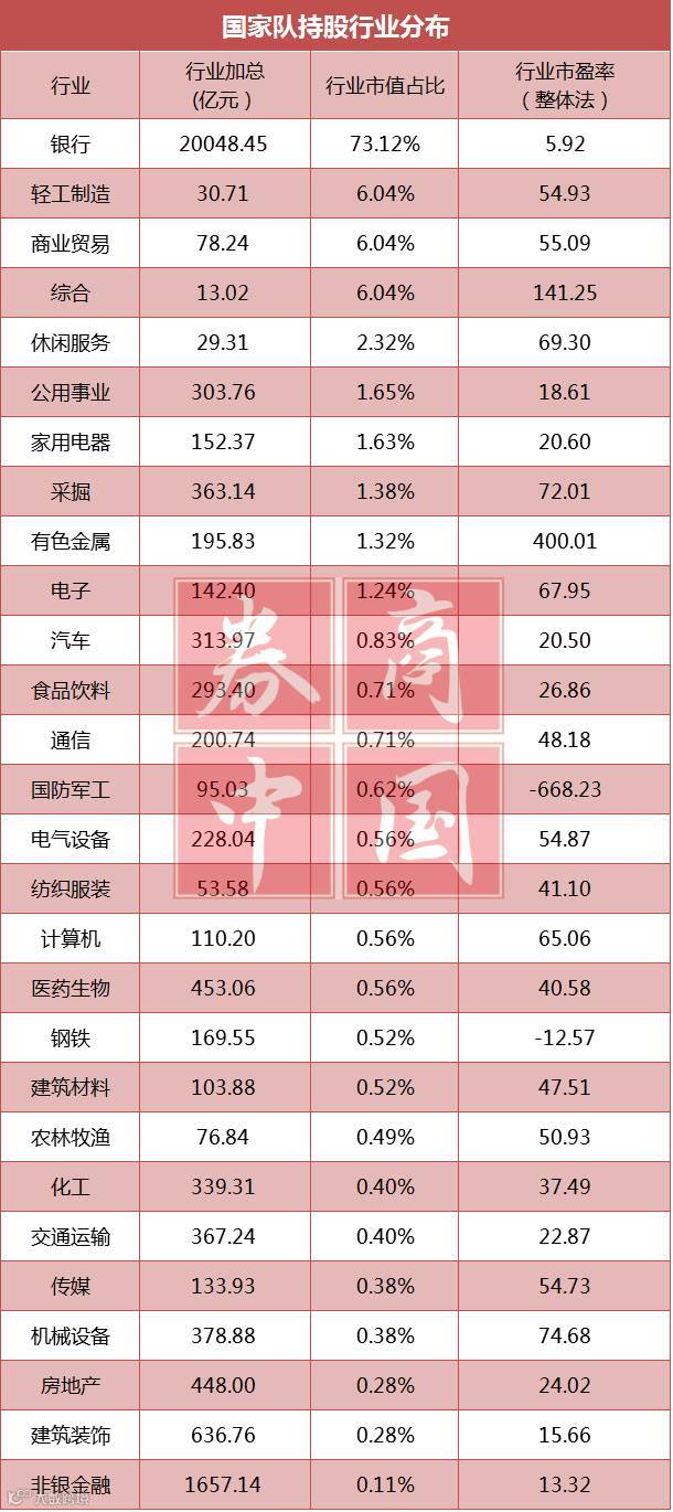 就行业分来看,“国家队”资金最为偏重银行、非银金融行业、建筑装饰和和医药生物,目前持有市值达到分别达到2万亿元、1657.14亿元、636.76 亿元和453.06亿元,占“国家队”持股总市值的73.12%、6.04%、2.32%和1.65%。值得一提的是,“国家队”最为重仓的银行、非银金融和建筑装饰都属于低估值板块,行业动态市盈率(整体法)目前只有5.92倍、13.32倍和15.66倍,是当前市场中估值最低的三个板块。