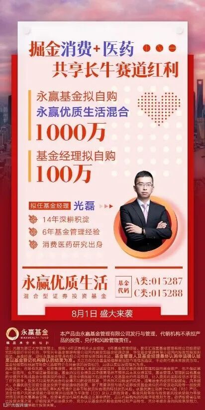 永赢优质生活是一只投资于优质生活主题相关资产的基金,关注医药和消费等行业的投资机会。医药和消费共通的逻辑在于,它们对应的都是人们对于美好生活的向往,具备长期生命力。因此,理论上这两个行业的优质公司有望创造长期现金流。当前医药和消费行业估值仍处于相对低位,长期投资价值显著,我们将积极挖掘其中的投资机会,力争给投资者带来可观的投资回报。