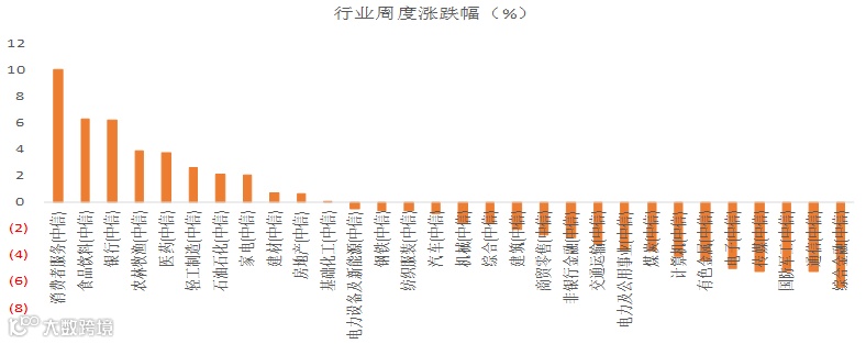 涨幅前三名行业为消费者服务、食品饮料和银行行业。