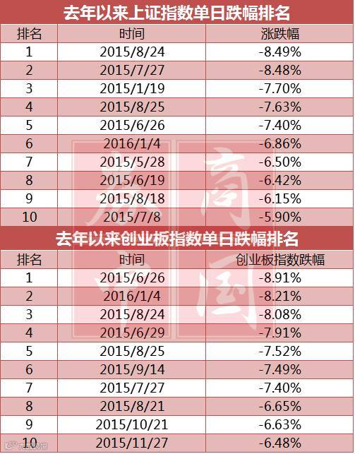 1、上证指数今日下跌6.86%,成为去年以来的第6大单日跌幅;创业板指数今日下跌8.21%,是去年以来的第二大单日跌幅