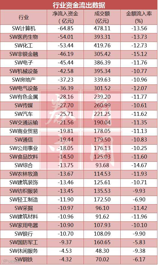 在行业板块方面,资金流出规模前五名分别为计算机、医药生物、化工、非银金融和电子,净流出资金分别达到64.85亿元、54.01亿元、53.44亿元、46.19亿元和45.44亿元。如果以金额流出率(资金净流出/成交金额)来看,非银金融则是资金流出最为明显的板块,金额流出率达到了15.12%,紧接着的则是综合、医药生物和计算机板块,分别达到14.67%、13.73%、13.56%。