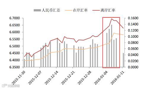 1月12日,离岸人民币汇率再度升值225个基点,收于6.5796,基本收复今年年初的失地;截至昨晚7点45分,人民币汇差收窄至50点。