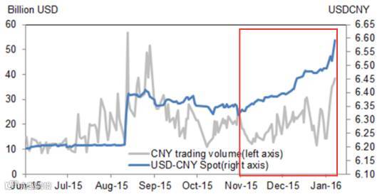 金融市场的可怕之处在于,一旦正反馈形成,将有更多投机资金进入并推动这一反馈,如此循环将导致某个趋势加速前进。事实上,从去年11月初以来,在岸人民币交易量开始快速上升,资金快速流出中国,而其中一部分资金不排除就进入了投机市场。参见图3: