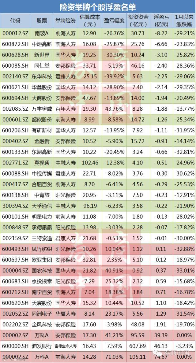 就浮亏规模来看,前海人寿去年举牌的南玻A和中炬高新都位居亏损规模前列。据估算,前海人寿在去年对南玻A和中炬高新的投资成本分别为12.90元和16.08元,分别买入股数为2.38亿股和1.61亿股。但在今年股价快速走低后,目前海人寿对南玻A和中炬高新的持股浮亏分别达到8.22 亿元和6.66亿元,浮亏比例分别为26.76%和25.87%。