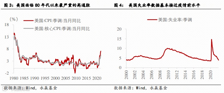 对于美联储而言,其在疫情后首要目标是朝充分就业迈进,并容忍了通胀的短期上涨,美联储主席鲍威尔直到8月份的全球央行会议上都认为通胀是暂时性的。但随着下半年通胀数据的节节攀升,叠加美国失业率数据的逐步走低,解决通胀逐步成为美联储的重点工作。12月的美联储议息会议上,鲍威尔的讲话透露Taper结束时点由22年6月提前至3月,并删除对暂时性通胀的表述。而1月5日美联储公布的12月议息会议纪要显示,多数参与者认同有必要提前或更快加息。最新的CME“美联储观察”表明,市场预期美联储在3月加息的概率接近8成,全年加息次数预期为3.4次。在加息预期不断增强的背景下,12月以来美债利率经历了一轮快速上行的过程。