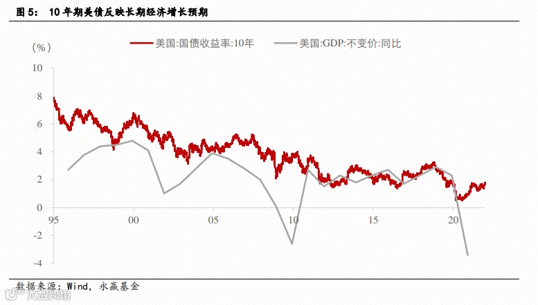 但由于10年期美债属于长端利率,与长期的经济潜在增速挂钩。上世纪90年代以来,10年期美债收益率中枢由8%下探至2%左右,很大程度反映了美国经济增速的下滑。按照美国国会预算办公室的预测,2022-2023年美国潜在经济产出增速在2.1%左右,并逐步下滑至2030年的1.7%。因此中长期美债大概率下行,但短期仍有上行空间。