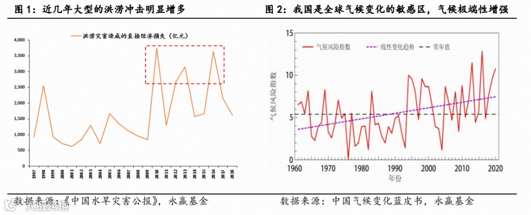 (1)极端气候发生的频率和范围都明显增加:今年8月,全球气候变化委员会发布的工作报告结论指出,未来全球极端天气的强度和频率将迅速增加;中国气候变化蓝皮书同样显示,中国是全球气候变化的敏感区和影响显著区,气候风险水平趋于上升。实际情况也确实如此:近几年来,有全域影响的洪灾数量明显增多:今年极端气象的频率、强度和覆盖范围也都明显提高一一河南暴雨、欧洲洪涝、美国干旱、飓风、暴雪寒潮等等;