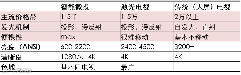 由此,智能微投具备相对难以被电视替代的场景主要是:1)低成本大屏;2)便携,易移动。