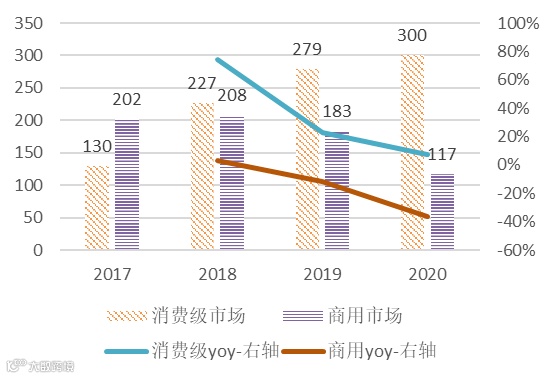 图:中国投影市场(消费级、商用)年出货台数(单位:万台)数据来源:IDC