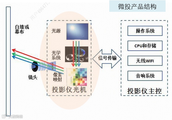 产品由三个模块组成,光源、光投射(镜头)、光调制(显示芯片),一般按照光机内技术单元的组合,有长焦LED光源投影(主流微投产品),和短焦激光光源投影(激光电视)这两种主要产品形态,其中我们探讨的智能微投更多指的是前者,也即LED光源的成熟投影产品。