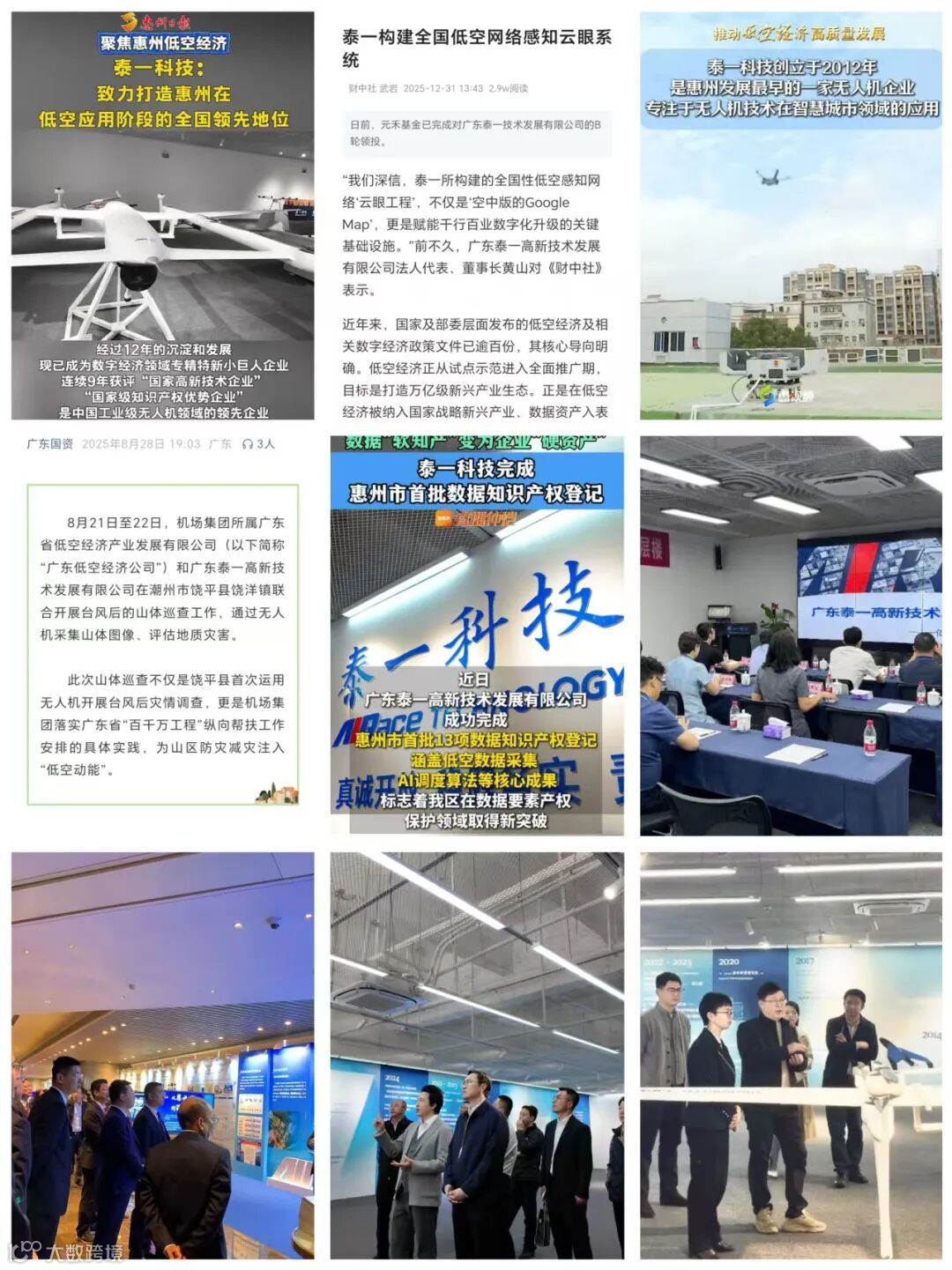 2025 年,泰一科技在低空经济领域的创新实践与标杆成果获得各大媒体的广泛关注与深度报道,从构建全国性低空网络感知知云眼系统的战略布局,到完成惠州市首批低空数据知识产权登记的技术突破,再到台风后山体巡查等应急任务中的实战能力,公司的行业影响力与品牌声量持续攀升;与此同时,泰一科技积极推动低空经济科普与公众认知提升,通过行业展会、研学活动、行业沙龙等多元形式,让政府领导、行业专家、青少年学生及社会公众近距离接触无人机技术、感知低空应用场景,以直观、可感的方式打破大众对低空经济的认知壁垒,让 “低空科技守护城市、服务民生” 的理念深入人心,既让低空科技赋能城市治理与产业升级的实践成果被更多人看见与认可,也为行业长远发展培育了更广泛的社会认知基础。