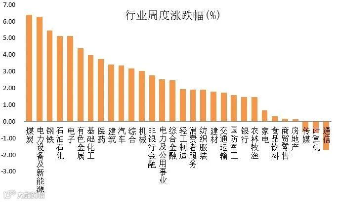 行业方面,上周行业板块有27个上涨,仅有3个下跌;其中,周期和成长风格均相对占优,其中表现相对较好的行业是煤炭、电新和钢铁等板块,而表现居后的则是通信、计算机和传媒等板块。